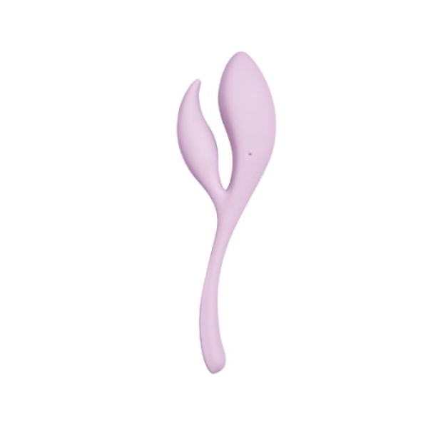 Dual-action toy with simultaneous vibrations. Arm nestles against vulva and clitoris for constant contact. Thick shaft curves against the G-spot.