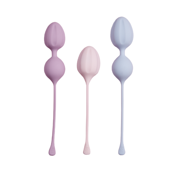 Three graduated soft, rounded body-safe silicone weights for Kegel exercises to help strengthen the pelvic floor. (BPA-, phthalate-and latex-free) for comfortable insertion with water-based lubricant.